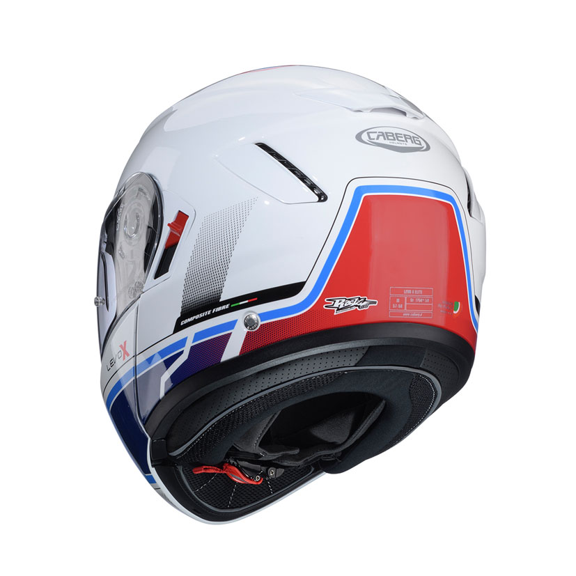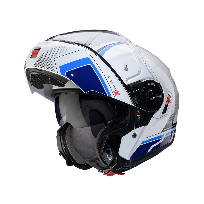 The two shell sizes offer the best fitting proportion between the shell volume and the motorcyclist’s head size. The LEVO X obtained the P/J dual homologation after passing the requirements set by the ECE 22.06 test regulations both for full face (P) and Jet (J) helmets that allows to ride also with the chin guard open. The ventilation system offers optimal comfort even during the most extreme conditions thanks to two air front vents, two rear air extractors, and the built-in channels present in the inner shell. The LEVO X is equipped with a panoramic ultra-wide visor that allows the best fields of vision, ensuring an amplified visibility in the front part equal to 82°. The helmet is also equipped with Pinlock Max Vision lens to avoid misting and an integrated sunshade visor (DVT Double Visor Tech) easy to manoeuvre with gloves. The lining, made with the best hypoallergenic and transpiring fabrics to grant maximum freshness, is entirely removable and washable. Moreover, the cheek pads have been conceived to permit the accommodation of glasses. Thanks to the space for the microphone and speakers, LEVO X is ready to be equipped with the communicator Caberg PRO SPEAK EVO and with the main universal communication systems on the market. To grant the maximum safety LEVO X passed all the ECE 22.06 tests also with Caberg Pro Speak EVO installed.
