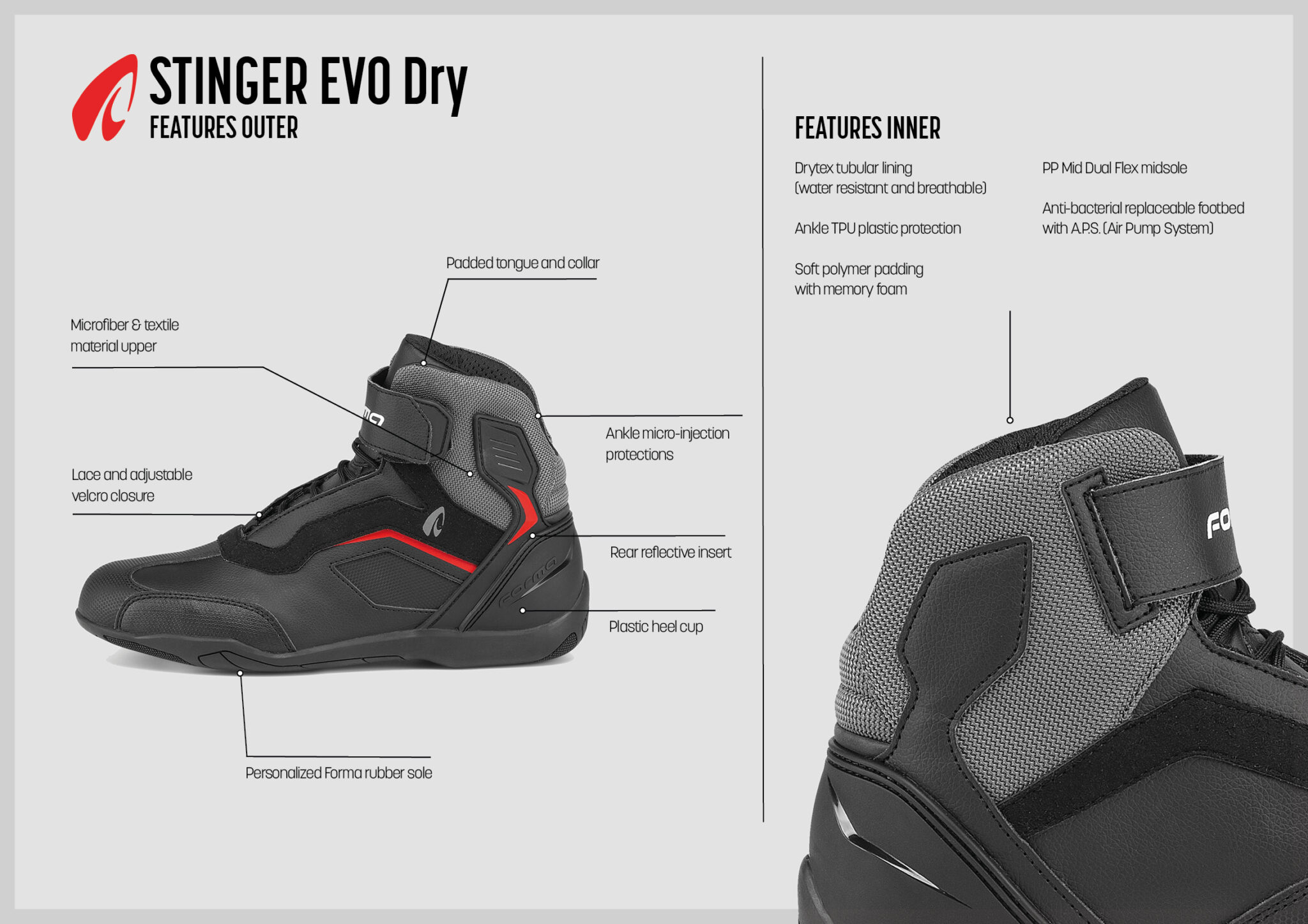 The Stinger Evo Dry is a shoe designed for a demanding and technically aware audience, but also in line with fashion and trends. Its sporty yet casual look makes it perfect for urban use. Made to be water-resistant, it is at the same time breathable: thanks to the Drytex membrane with Forma customised inserts, it keeps the foot dry in all circumstances.