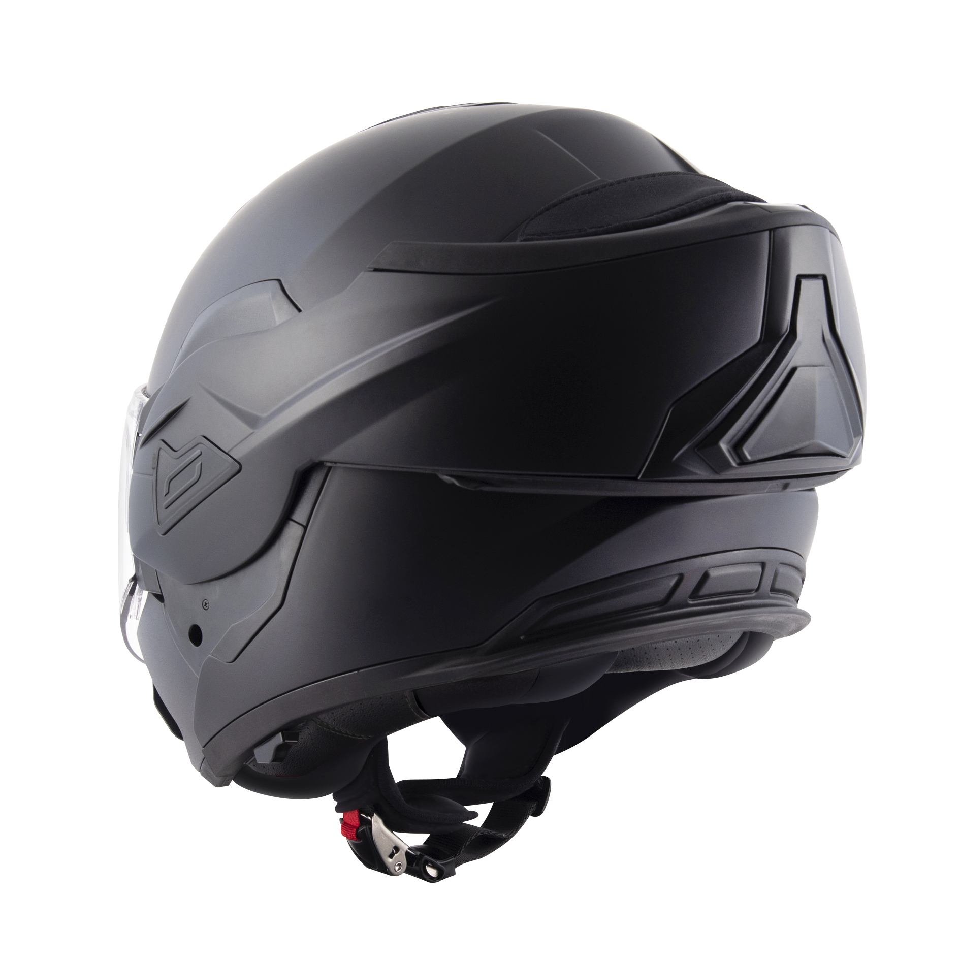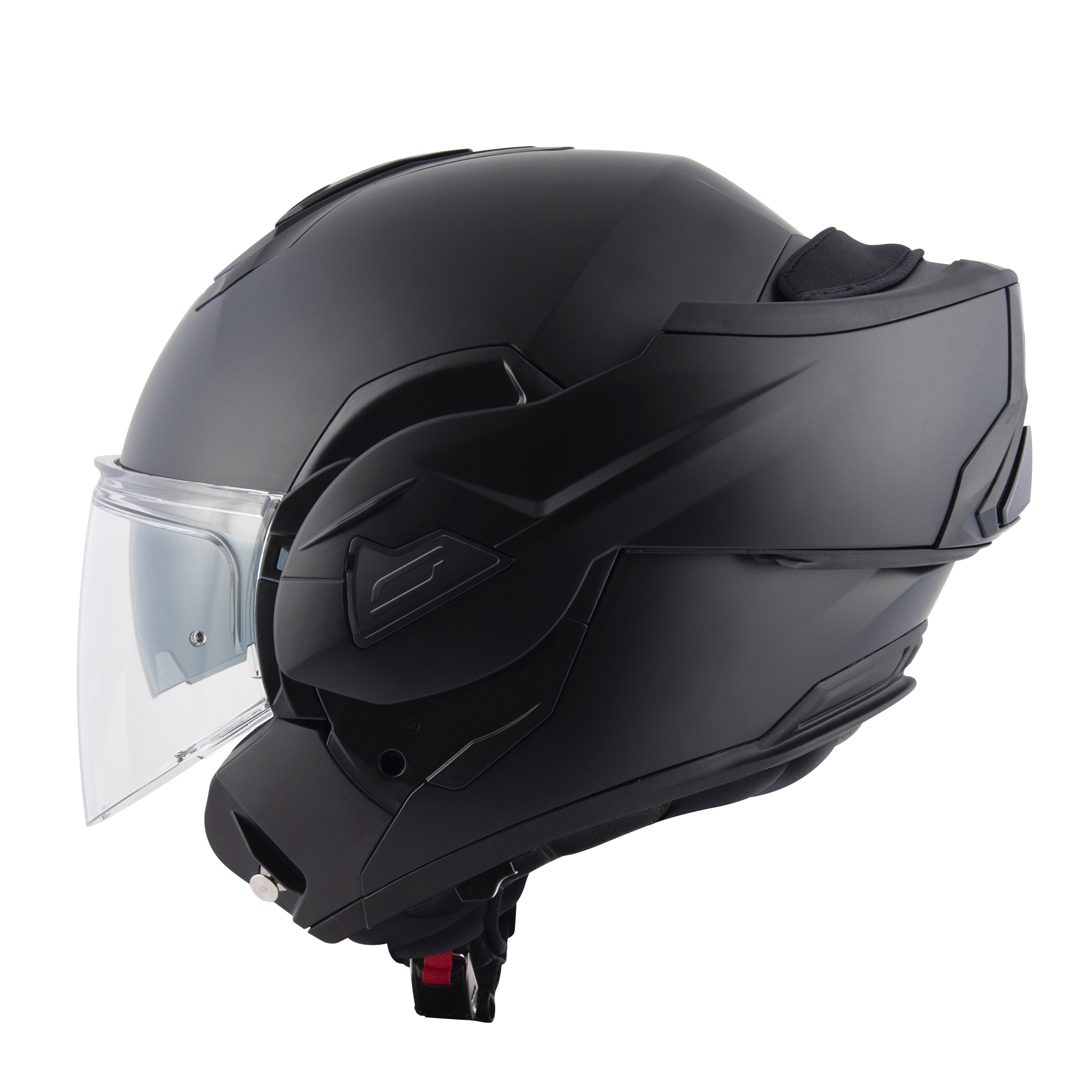 The helmet is equipped with a double visor: a transparent one to protect from wind and debris and an integrated sun visor to block sunlight. Weighing in at 1,700 grams, it sits in the mid-range for modular helmets, offering a good balance between protection and comfort. The extra weight is due to the strength of the material and the flip-back mechanism.