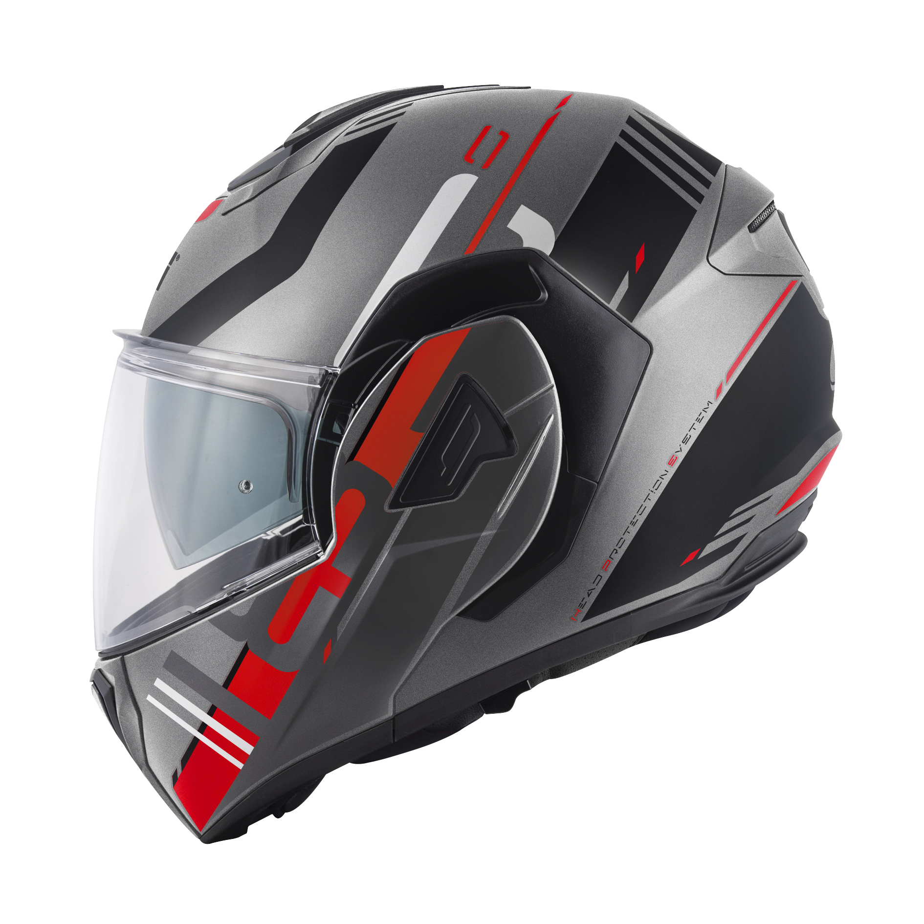 The helmet is equipped with a double visor: a transparent one to protect from wind and debris and an integrated sun visor to block sunlight. Weighing in at 1,700 grams, it sits in the mid-range for modular helmets, offering a good balance between protection and comfort. The extra weight is due to the strength of the material and the flip-back mechanism.